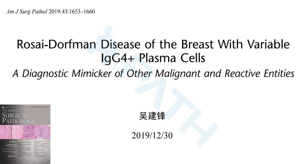 发生于乳腺的Rosai-Dorfman病伴lgG4+浆细胞