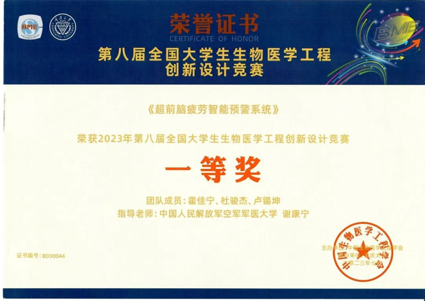 谢康宁副教授指导的生物医学工程本科学员霍佳宁、杜骏杰、卢锡坤完成的参赛作品《超前脑疲劳智能预警系统》获一等奖,该项目以脑调节系统能力测量为关键,研制了疲劳超前检测、预测及智能干预设备,可用于驾驶疲劳、飞行疲劳等预测和干预,减少驾驶、飞行安全隐患。史学涛教授指导的生物医学工程硕士研究生李俊瑶、朱明旭、王伟策完成的参赛作品《多信息心肺功能监测系统》获二等奖,该项目基于生物电阻抗原理,通过多项核心创新技术,实现了心脏射血活动、肺通气及肺灌注状态的实时、无创、连续监测,有望广泛应用于手术室、ICU、心脏内科、心脏外科以及呼吸科等临床科室。
