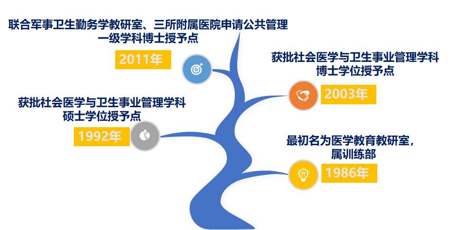 教研室始建于1986年,初名为医学教育教研室,属学校训练部。1986年获批社会医学与卫生事业管理硕士学位授权点,2003年获批社会医学与卫生事业管理博士学位授权点。2011年,联合军事卫生勤务学教研室、三所附属医院获批公共管理一级学科博士学位授予点。在机构设置上,卫生事业管理与医学教育教研室为该一级学科的负责教研室。