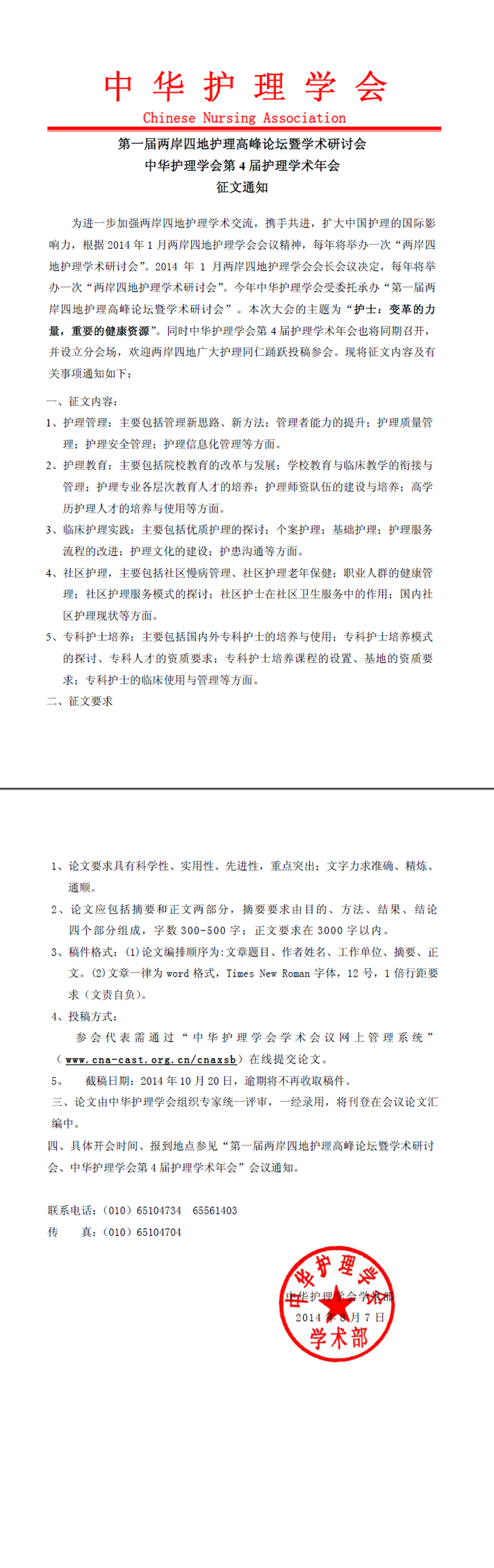 第一届两岸四地护理高峰论坛暨学术研讨会中华护理学会第4届护理学术年会征文通知