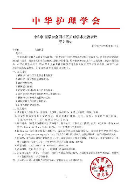 中华护理学会社区护理交流会议征文通知