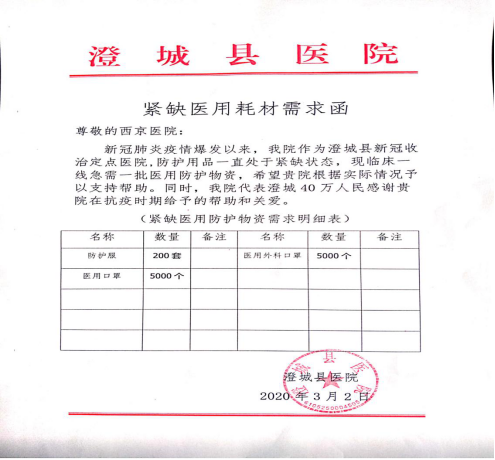 视频会议中,针对疫情防控和年度扶贫攻坚工作展开了热烈讨论,制定形成了疫情联控机制和年度扶贫计划,并向澄城县医院捐赠防护服200套,医用外科口罩、护理口罩共10000只紧缺抗疫物资,安排3名疫情防控专家为县医院3例特殊病案进行现场视频会诊。西京医院党委表示:“军地两家医院结上了亲戚、成为了好朋友,我们将尽全力给予最大的支持,我们有决心和信心,一定能够打赢防疫脱贫两场战役,确保疫情期间扶贫工作不断线。”