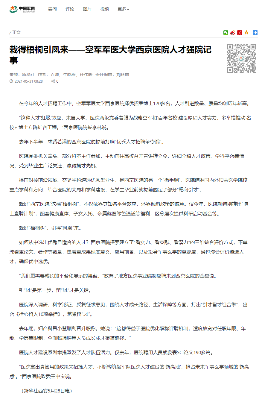 [中国军网]栽得梧桐引凤来——beat365中文官方网站西京医院人才强院记事