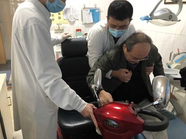 照片中被谢医生抱起的患者叫周富平,今年52岁,早年间因车祸导致胸部以下截瘫,基本丧失了正常生活的能力。由于没有成家,身边又没有能够照顾他的人,他的起居生活基本都是依靠自己。10月17日下午临近下班时间,周富平驾驶一辆三轮代步车来到口腔医院修复科就诊,想解决困扰了他很久的牙齿问题。谢医生接诊后,详细了解患者的病情,同时也被他坚强、乐观的心态所感动。由于当时需要患者坐到椅位上做详细检查,而且周富平行动不便,身上又插着尿管、带着尿袋,所以决定将他抱上椅位。谢医生将周富平的代步车推至椅位旁,把他抱起后,在吴楠护士和王维玺医生的配合下,顺利将周富平抱至牙椅上。