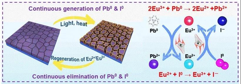 为提高本征稳定性,北京大学工学院周欢萍研究组、化学与分子工程学院严纯华/孙聆东研究组及其合作者提出,通过在钙钛矿活性层中引入铕离子对(Eu3+/Eu2+)作为“氧化还原梭”,可同时消除Pb0和I0缺陷,进而大幅提升器件使用寿命。有趣的是,该离子对在器件使用过程中没有明显消耗,对应的器件的效率最高达到了21.52%(认证值为20.52%),并且没有明显的迟滞现象。同时,引入铕离子对的薄膜器件表现出优异的热稳定性和光稳定性,在连续太阳光照或85oC加热1000小时后,器件仍可分别保持原有效率的91%和89%;在最大功率点连续工作500小时后保持原有效率的91%。