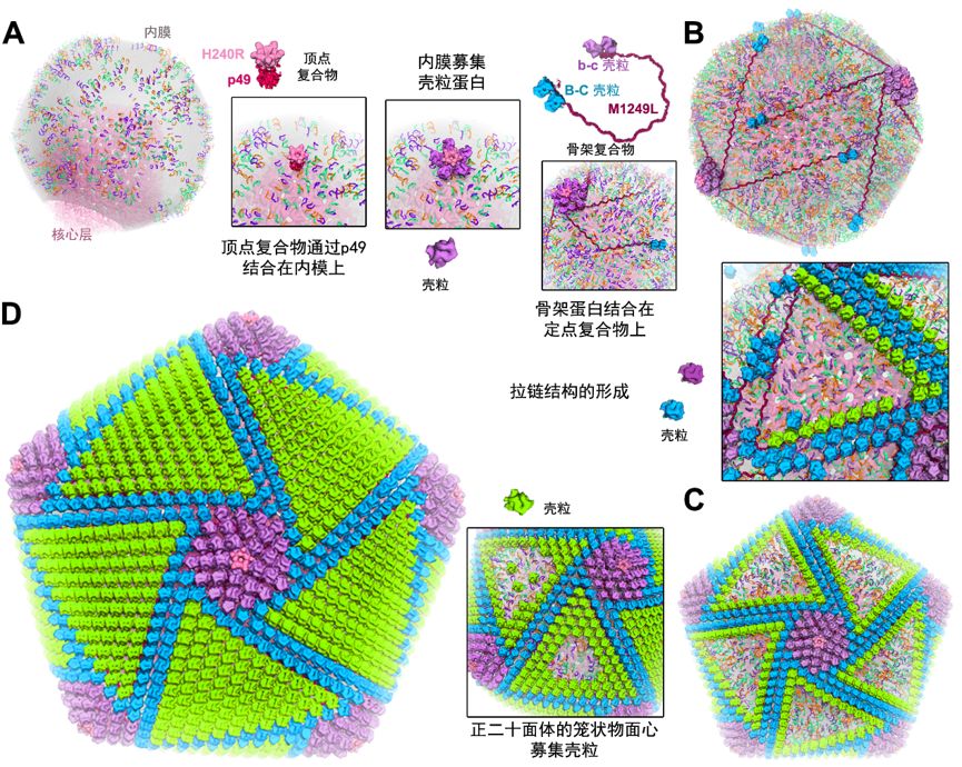 该衣壳颗粒体型巨大且结构复杂,由17,280个蛋白亚基组成,其中包括1种主要(p72)和4种次级衣壳蛋白(M1249L、p17、p49和H240R),它们组装成五重对称体和三重对称体的复合结构。主要衣壳蛋白p72原子分辨率结构展示出非洲猪瘟病毒潜在的构象型抗原表位,与其他的核胞质大DNA病毒((NCLDV)显著不同。次级衣壳蛋白在衣壳内表面形成了一个复杂的蛋白相互作用网络,通过调控相邻的病毒壳微体之间的作用力介导衣壳的组装并稳定了衣壳的结构。作为核心的组织者,100纳米长的M1249L蛋白沿着三重对称体的每个边缘桥接了两个相邻的五重对称体,与其他衣壳蛋白形成了延伸的分子间网络,驱动了衣壳框架的形成。这些结构细节揭示了衣壳稳定性和组装的分子基础,对非洲猪瘟疫苗的研发具有十分重要的理论指导意义。