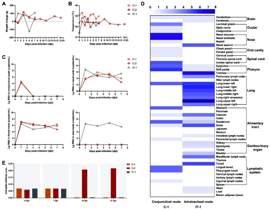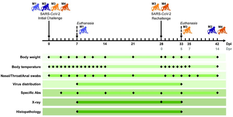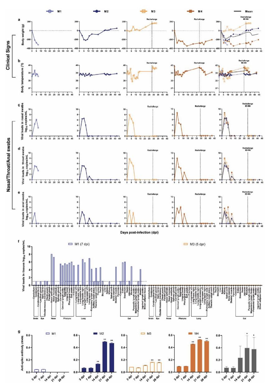 研究者对4只恒河猴气道接种半致死剂量的SARS-CoV-2,对体重、体温、X光、血清学和各种拭子样本进行检测,发现有3只猴子感染后7天体重略微减轻,所有猴子均未观测到直肠温度变化,临床数据表明在接种病毒后出现暂时性食欲下降、呼吸率提高和弓身现象。鼻拭子和咽拭子在感染后3天病毒载量最高,随后开始下降。同样地,肛拭子病毒载量第3天最高,第14天下降到检测限以下。