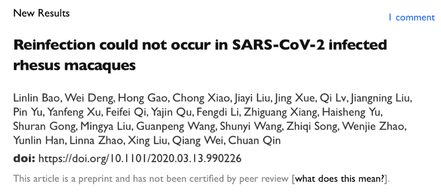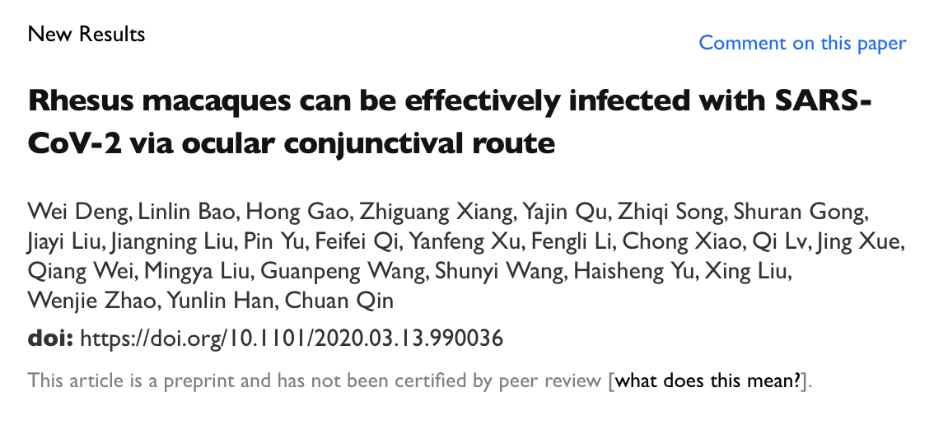 2020年3月14日,中国医学科学院实验动物研究所、北京协和医学院秦川团队在预印版bioRxiv上同时发表了两篇研究论文:“Reinfection could not occur in SARS-CoV-2 infected rhesus macaques”和“Rhesus macaques can be effectively infected with SARS-CoV-2 via ocular conjunctival route”,建立了恒河猴的SARS-CoV-2感染模型,阐述了恒河猴的COVID-19特征,确定了SARS-CoV-2的气道感染和结膜感染途径以及康复后不会发生再次感染现象。值得注意的是,秦川团队此前曾于2005年和2014年先后建立SARS-CoV感染和MERS-CoV感染的恒河猴模型【4-5】。