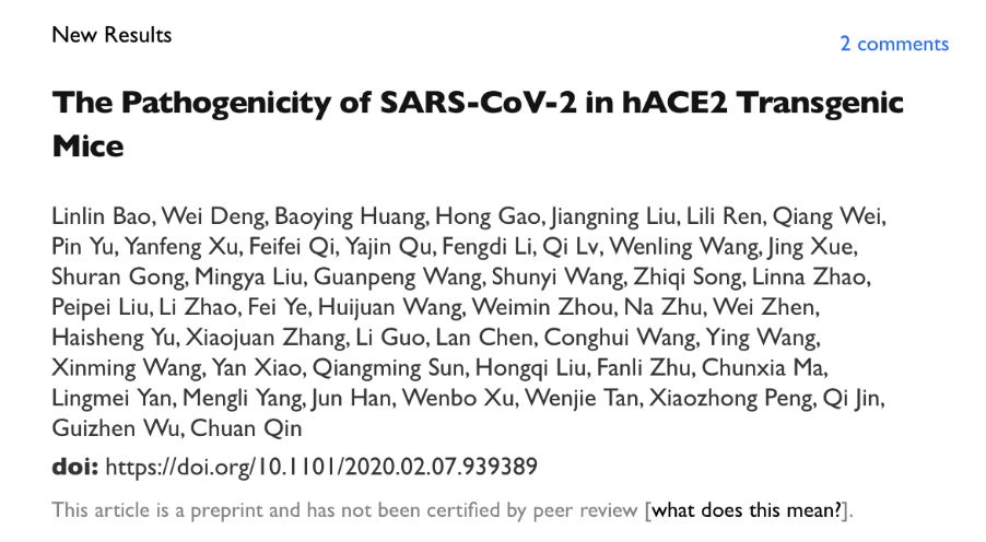 自2019年12月SARS-CoV-2引起的COVID-19爆发以来,已对中国乃至全球构成重大的的公共卫生威胁。截至3月15日,全球40多个国家/累计确诊人数超过15万,死亡人数近6千人,目前尚无好转迹象。动物模型对于阐明病毒感染与发病机制、传播途径以及抗病毒药物和疫苗评价至关重要。2020年3月9日,Nature发表新闻,实验室竞相开展SARS-CoV-2的动物模型研究,曾为SARS-CoV研发的转基因小鼠供不应求【1】。此前中国医学科学院实验动物研究所秦川团队研制的动物模型已于2月18日通过科技部组织的鉴定,率先建立了COVID-19的转基因小鼠模型和恒河猴模型【2】。转基因小鼠模型的研究经过两次修改,已于2月28日将该第三版本的论文上传至预印版bioRxiv,该研究阐明了hACE2小鼠中SARS-CoV-2感染的致病性,促进了抗病毒药物治疗研究和疫苗开发【3】。