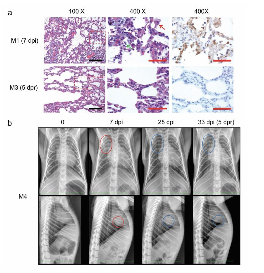 图3. SARS-CoV-2感染的恒河猴病理切片和胸部X光的跟踪检测