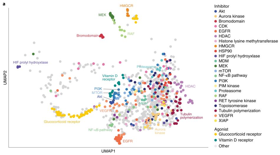 基于上述高维度细胞系药物敏感性数据集,研究者利用UMAP降维以药物为数据点将其映射在二维空间中,从而对各类药物间的相对分布关系有了直观的理解。其中可以看到,总体上大多数药物难以通过其已知的靶标或作用机制得到明确区分,但仍有部分药物,包括糖皮质激素类药物、EGFR抑制剂和HDAC抑制剂等形成了单独的聚合体,表明与其他药物间的差异较为明显。