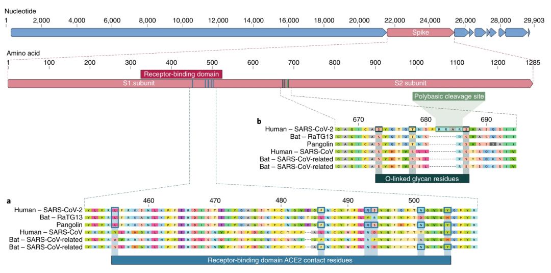 图1:人SARS-CoV-2及其近缘冠状病毒的刺突蛋白特征。a,SARS-CoV-2刺突蛋白的结合氨基酸中的突变。SARS-CoV-2刺突蛋白(顶部红色条)与亲缘关系最近的SARS-CoV样冠状病毒,以及SARS-CoV本身的对比。蓝色框表示SARS-CoV-2以及SARS-CoV(Urbani毒株)等近缘病毒中,与ACE2受体结合的刺突蛋白的关键氨基酸。b,多碱基切割位点及O连接聚糖的获得。多碱基切割位点及附近三个推测的O连接聚糖都是SARS-CoV-2所独有的特征,之前在β冠状病毒B谱系中从未发现过。图中序列来自于NCBI GenBank数据库,序列号为MN908947、MN996532、AY278741、KY417146以及MK211376。穿山甲冠状病毒序列来自于SRR10168377和SRR10168378(NCBI BioProject PRJNA573298)29,30。