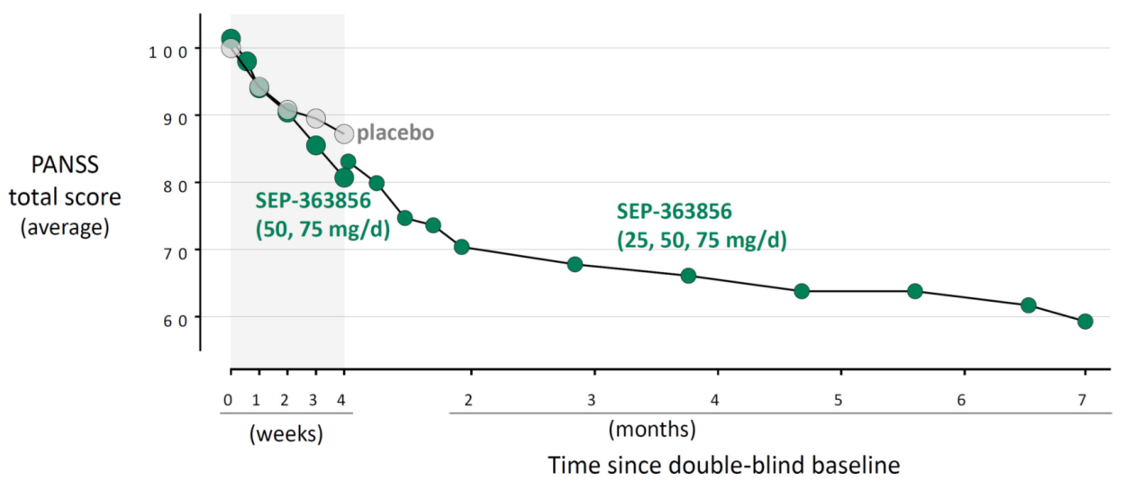 对于77名双盲期即接受SEP-363856治疗的受试者,延展治疗期基线至26周时的PANSS总分平均变化为−17.1±12.4;对于79名双盲期接受安慰剂治疗者,PANSS总分平均变化为−27.9±16.4。