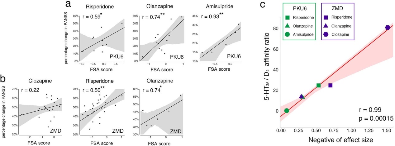 通过前瞻性的补充分析,研究进而发现FSA对治疗效果的预测可能取决于抗精神病药物的Meltzer比例(五羟色胺5-HT2A与多巴胺D2的亲和力之比),这意味着对于纹状体功能异常严重的精神分裂症患者,针对纹状体多巴胺D2受体为主要靶点的药物可能无法调和多巴胺系统的功能恢复,而需要借助多靶点联合机制抗精神病药物或其他非药物手段干预治疗,因此研究提示FSA标记可能在精神科医生个体化治疗方面具有一定的指导作用。