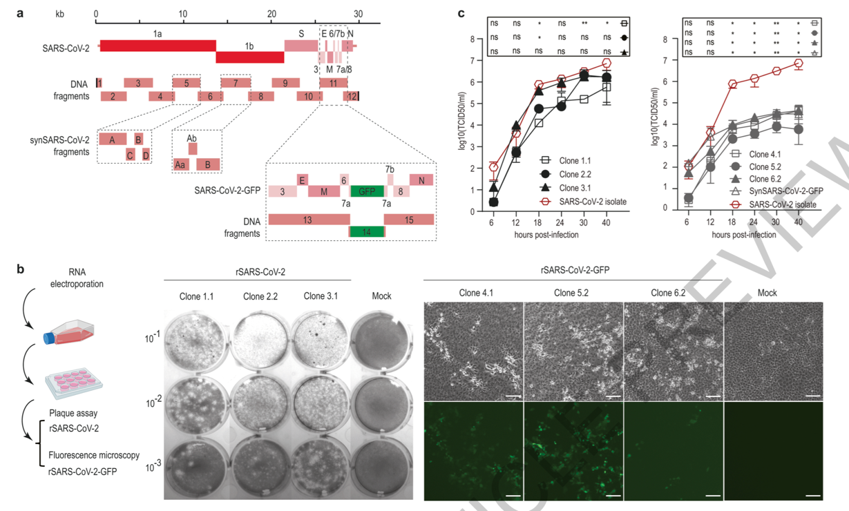 研究者进一步测试了其他冠状病毒、寨卡病毒以及在大肠杆菌中难以保持稳定的人呼吸道合胞病毒,结果表明,无论病毒来源如何、核酸模板或DNA片段数量如何,在酵母中克隆这些病毒基因组都是成功的。值得注意的是,人呼吸道合胞病毒克隆的过程中,预先未直接从临床样本中获得任何基因组信息。这些结果表明,该合成基因组学平台可以利用病毒分离物、克隆性DNA、合成性DNA或临床样本等快速合成分子克隆。最后研究人员以相似的方式克隆了SARS-CoV-2的全病毒基因组并成功合成了rSARS-CoV-2和rSARS-CoV-2-GFP,其复制动力学与分离的病毒相似。