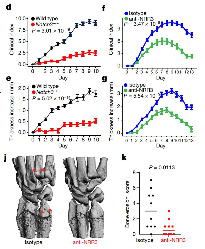 作者发现NOTCH3信号传导有助于壁细胞(mural cells)和表达THY1的亚内层成纤维细胞的分化,而这一步骤是炎症性关节炎发展所必需的。作者用scRNA-seq检测Notch3在小鼠滑膜中的表达,并确定它仅限于壁细胞和成纤维细胞,与血管周围细胞中Notch受体激活增加一致,关节炎状态下,这些细胞的Notch信号活性评分明显比正常状态时高。当将严重性关节炎模型小鼠K/BxN mice的血清输入到正常小鼠时,表现出明显的关节炎和肿胀症状,而当输入到Notch3敲除小鼠时,症状明显较弱。另外,当对小鼠进行每周两次的NOTCH3拮抗抗体(anti-NRR3)治疗,也能够显著减轻关节炎和肿胀症状。此外,anti-NRR3的治疗方案还显著减少了骨侵蚀。