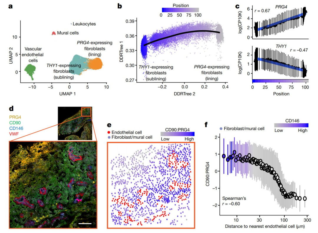 组织的功能取决于其结构设计,这种设计的核心概念是细胞分区(Cellular zonation),细胞分区可以反映细胞之间的分工。此前,已有文章报道,在脑和肠道等组织器官中存在scRNA-seq转录梯度与细胞位置特征之间的对应关系【3】。在这篇文章中,作者应用scRNA-seq,确定了在滑膜组织中的转录梯度和细胞位置特征。