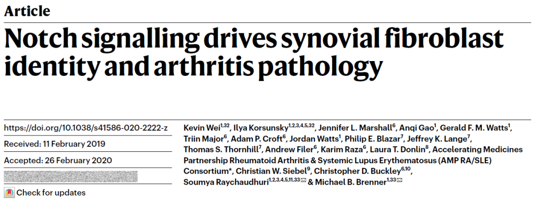 近日,哈佛医学院的Soumya Raychaudhuri和Michael Brenner团队在Nature杂志上发表题为Notch signalling drives synovial fibroblast identity and arthritis pathology的研究论文。在这篇文章中,作者确定NOTCH3信号在表达THY1的血管周围的和亚内层成纤维细胞分化中起关键作用。利用单细胞RNA测序(scRNA-seq)和滑膜组织类器官(organoids),作者发现NOTCH3信号驱动成纤维细胞的转录及自从血管内皮细胞向外方向的空间梯度分布。在活动性类风湿关节炎中,滑膜成纤维细胞中的NOTCH3和Notch靶基因明显上调。在小鼠中,敲除Notch3基因或使用抗体阻断NOTCH3信号能够缓解炎症,防止炎症性关节炎的关节损伤。这些结果表明滑膜成纤维细胞的位置特性(positional identity)受到内皮细胞来源的Notch信号调节,而这种由基质间的信号互作正是炎症性关节炎中的炎症来源和病理学基础。