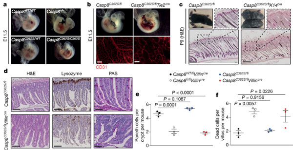 研究表明,酶活性丧失的CASP8(C362S)的表达,通过诱导细胞坏死性凋亡和细胞焦亡引起小鼠胚胎致死。与Casp8-/-小鼠类似,在内皮细胞坏死性凋亡导致心血管缺陷后Casp8C362S / C362S小鼠胚胎死亡。MLKL缺陷回复了心血管表型,但却引起了Casp8C362S / C362S小鼠的围产期死亡,表明CASP8(C362S)在胚胎发育的后期导致细胞坏死性凋亡非依赖性死亡。与肠上皮细胞特异性Casp8敲除小鼠相似,肠上皮细胞中caspase-8催化活性的特异性丧失引起肠道炎症。通过额外敲除Mlk1来抑制细胞坏死性凋亡会严重加剧肠道炎症,并在Mlkl敲除小鼠中导致早产致死,这是由于肠上皮细胞中的caspase-8催化活性特异性丧失。CASP8(C362S)的表达引发了ASC斑点的形成,caspase-1的活化和IL-1β的分泌。在Casp8C362S / C362SMlk1-/-Asc-/-或Casp8C362S/C362SMlkl-/-Casp1-/-小鼠中,胚胎致死率和早产死亡率都得到了完全回复,这表明当细胞坏死性凋亡被阻断,炎性小体的激活促进CASP8(c362)介导的组织病理学。因此,caspase-8代表了控制细胞坏死性凋亡和细胞焦亡的分子开关,并阻止了胚胎发育和成年期的组织损伤。