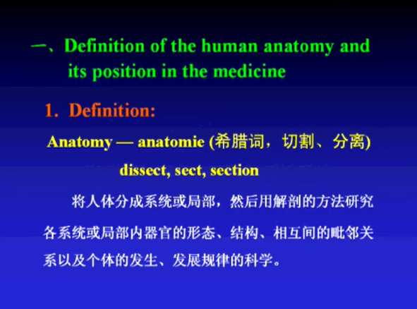 人体解剖学human anatomy 是一门研究正常人体形态和结构的科学,隶属于生物科学的形态学范畴。它与医学各科有着密切的联系,是医学科学的一门重要基础课程。只有在充分认识人体形态和结构的基础上,才能正确理解人的生理现象和病理过程,否则就无法判断人体的正常与异常,区别生理与病理状态,更不能对疾病进行正确的诊断和治疗。