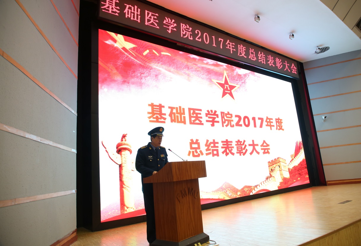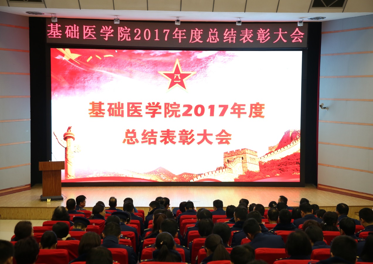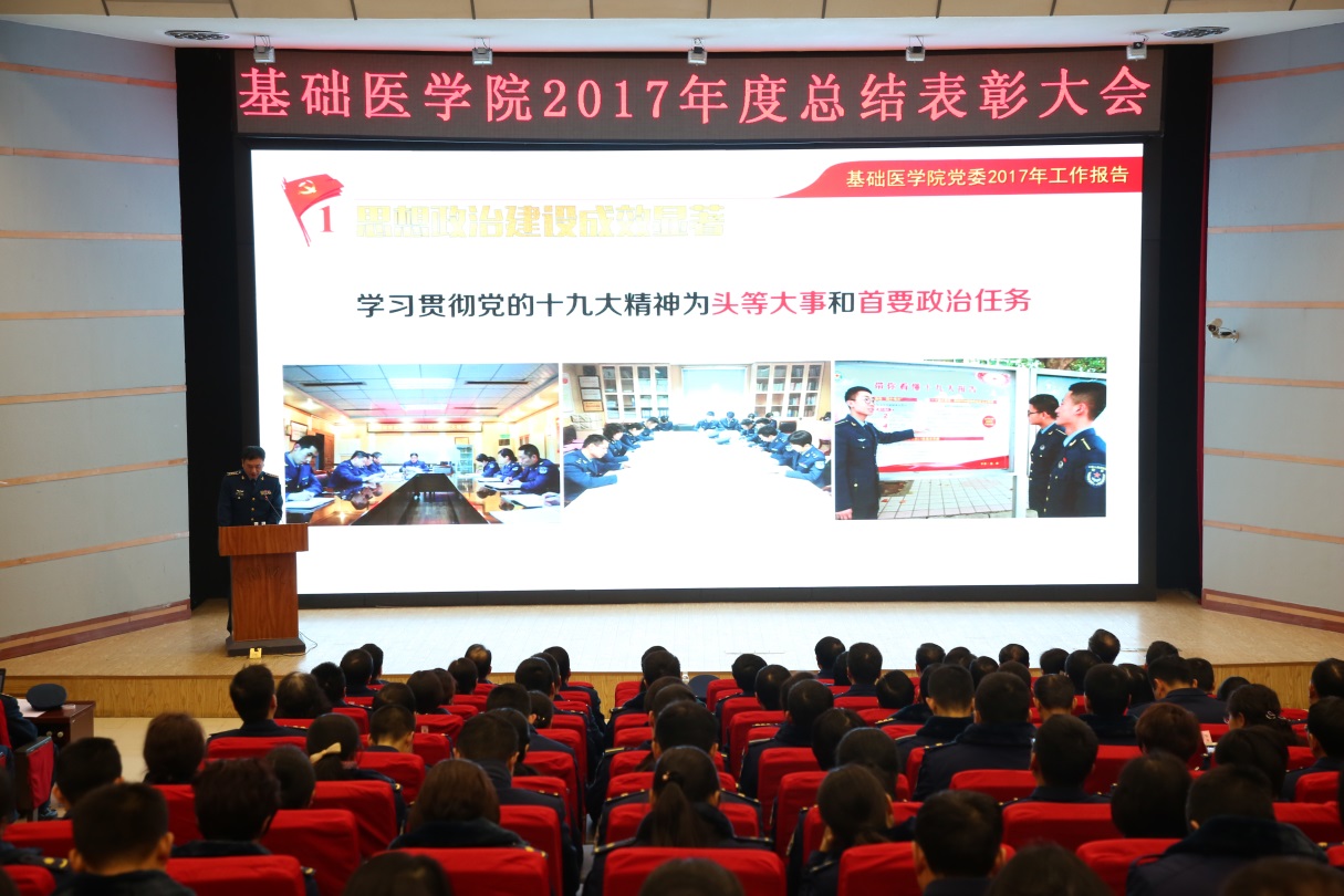 1月29日下午,基础医学院在科学会堂召开院2017年度总结表彰大会,学院领导、三级以上专家教授和全体干部及部分学员、文职人员代表,共320余人参加。会议由党委书记秦毓荣主持。