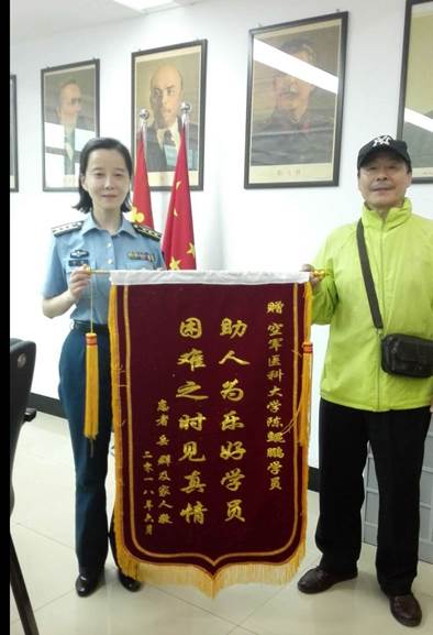 经过详细询问,原来该男子的姐姐于四月中旬突发急症送往西京医院救治,但到医院之后却犯了难,因为人生地不熟,病人本身已经无法动弹,陪的人又老的老小的小,连搬运患者都没法完成。这时多亏陈昆鹏站了出来,在简单了解情况后二话不说就开始帮忙,从搬运患者到帮助挂号,跑前跑后大半天,直到把患者安顿好之后才离开。“小伙子人太好了,帮了我们这么大的忙最后问他联系方式都不愿意留,再三追问才知道是咱们空医大的学员叫陈昆鹏。我姐姐说要没有这孩子那天不知道得多受多少罪,让我一定想办法把锦旗给孩子送来。我也是打听了好长时间才找到这里,早上我来了发现有好几个大队好几栋楼,陈昆鹏到底在哪儿又让我犯了难,幸亏碰到一位姓贾的教员,告诉我这孩子是一大队的。两个月了,我终于完成了我们全家人的心愿,真感谢你们培养了这么好的学员啊。”男子眼泛泪光激动的述说着。