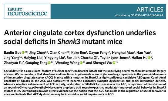 基础医学院神经生物学教研室博士研究生郭保霖在导师武胜昔教授、辅导老师王文挺副教授的指导下潜心求索,在自闭症发病机制研究上取得了新发现,为临床治疗提供了新思路。7月22日,这一研究成果被神经科学研究领域顶级期刊《Nature Neuroscience》(影响因子:21.126)在线刊发,并被选为当期杂志封面文章。武胜昔教授、王文挺副教授为论文的通讯作者。这是beat365首次以第一作者及通讯作者单位在Nature Neuroscience上发表原创性研究论文,体现了beat365基础医学及神经科学领域研究水平的跃升。