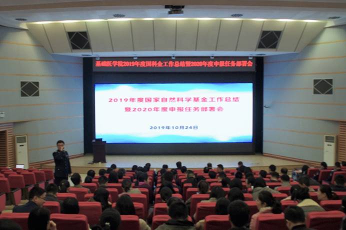 10月24日下午,基础医学院在科学会堂召开2019年度国科金工作总结暨2020年度申报任务部署会,学院领导、机关干部、专业技术干部、文职人员和部分研究生共200余人参会。会议由秦毓荣政委主持。