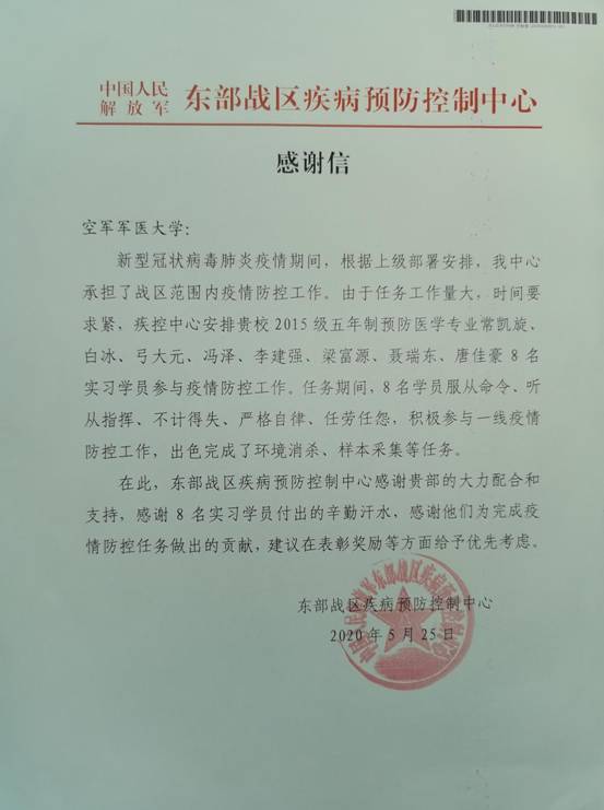 5月30日,2015级预防专业8名实习学员完满完成实习任务、顺利返校,通过这次别样的实习,他们的心理经受了疫情考验,能力得到了实践检验,为即将走上工作岗位、为成为合格的军事公共卫生人才打下了坚实基础。