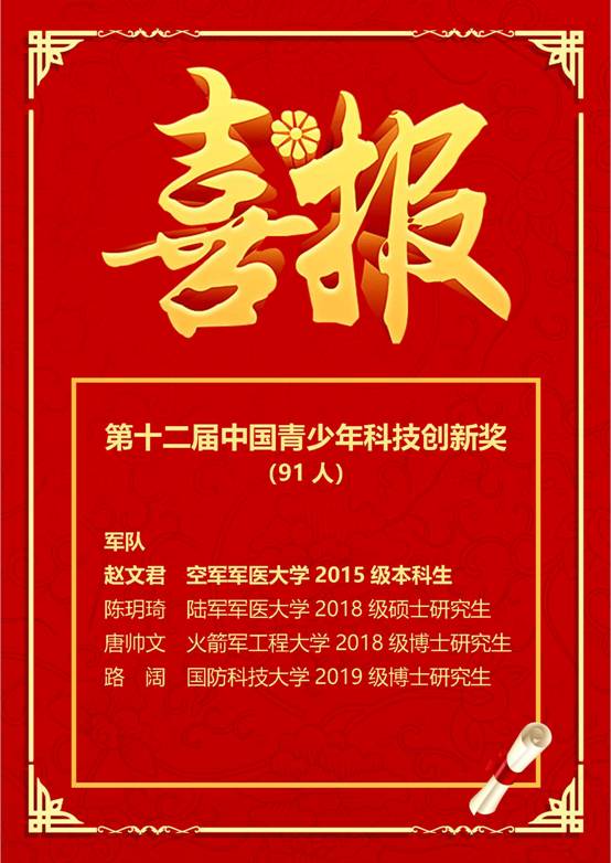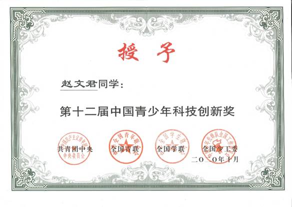 设立以来,已累计开展12届,评选奖励1190人。自今年6月启动评选以来,经院、校、空军机关、中央军委逐级推荐、资格审查和终审会远程答辩,赵文君获评第十二届“中国青少年科技创新奖。”