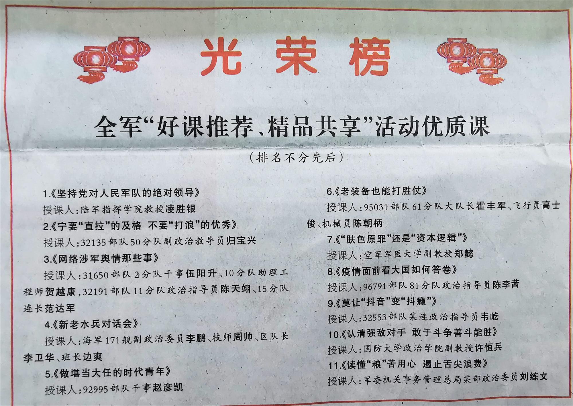 为持续推动习近平新时代中国特色社会主义思想、习近平强军思想武装官兵,进一步凝聚强军意志,构建新时代我军思想政治教育体系,自2020年起军委政治工作部在全军范围内开展“好课推荐、精品共享”活动,推动思想政治教育上下一体联动,同步同向用劲。活动启动后,各单位高度重视,广泛动员,集智攻关,共选送700多堂课程参与角逐。后经领导审批、专家集中评审、综合官兵网上评论和点击下载量,全军共遴选出11堂优质课予以通报表彰。2021年1月23日解放军报于头版刊发新闻并在第二版发布光荣榜。