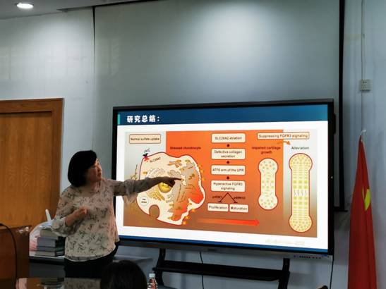 骨骼发育疾病严重威胁人类健康且缺乏药物干预手段,解码骨骼发育疾病分子机制是创新研发药物的必要前提。杨柳教授课题组对临床骨骼遗传病椎弓峡部裂进行全基因组测序,发现了硫酸根转运体蛋白SLC26A2新的致病突变位点,构建了遗传修饰小鼠并基于体内遗传示踪技术,探索骨软骨特定细胞谱系动态演变及关键调控因素。从基因遗传突变的角度深入研究椎弓峡部裂、软骨发育不良和骨发育不良的发病机制,探讨体内药物干预对SLC26A2相关软骨发育不良的治疗作用。SLC26A2课题在遗传方面的研究具有临床实际意义,是退变再生及损伤修复研究的基础。经过杨柳教授的讲解,通过积极提问、交流和讨论,全体人员对SLC26A2基因和骨骼发育异常疾病有了更深刻的认识和理解。