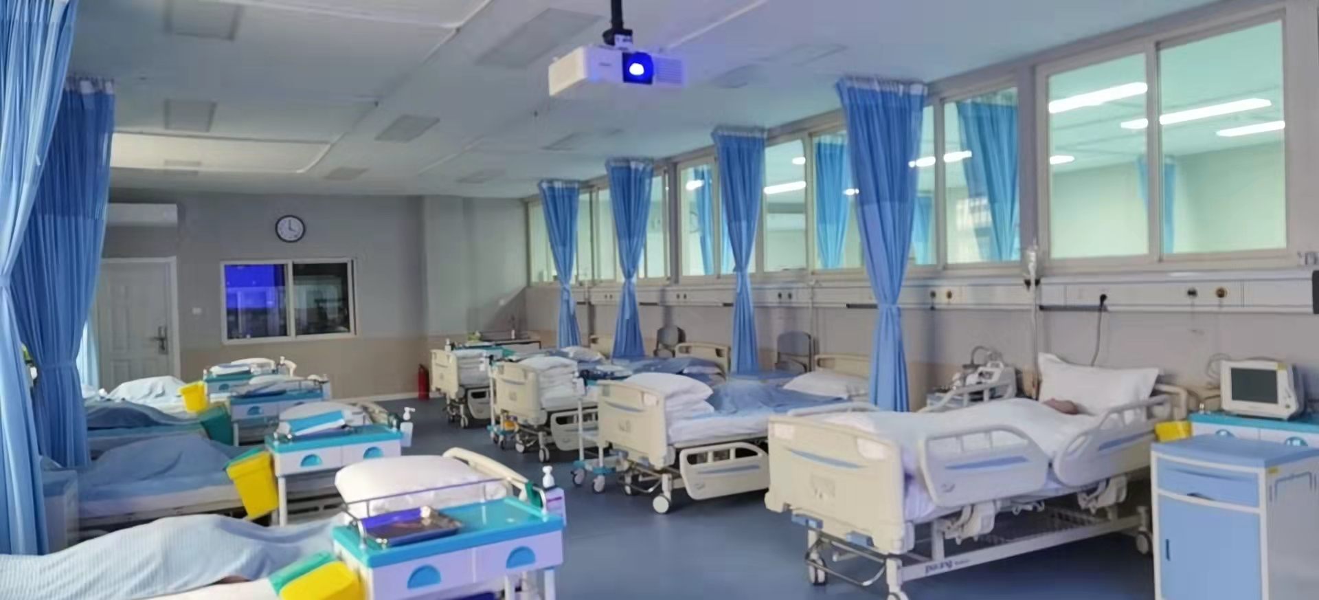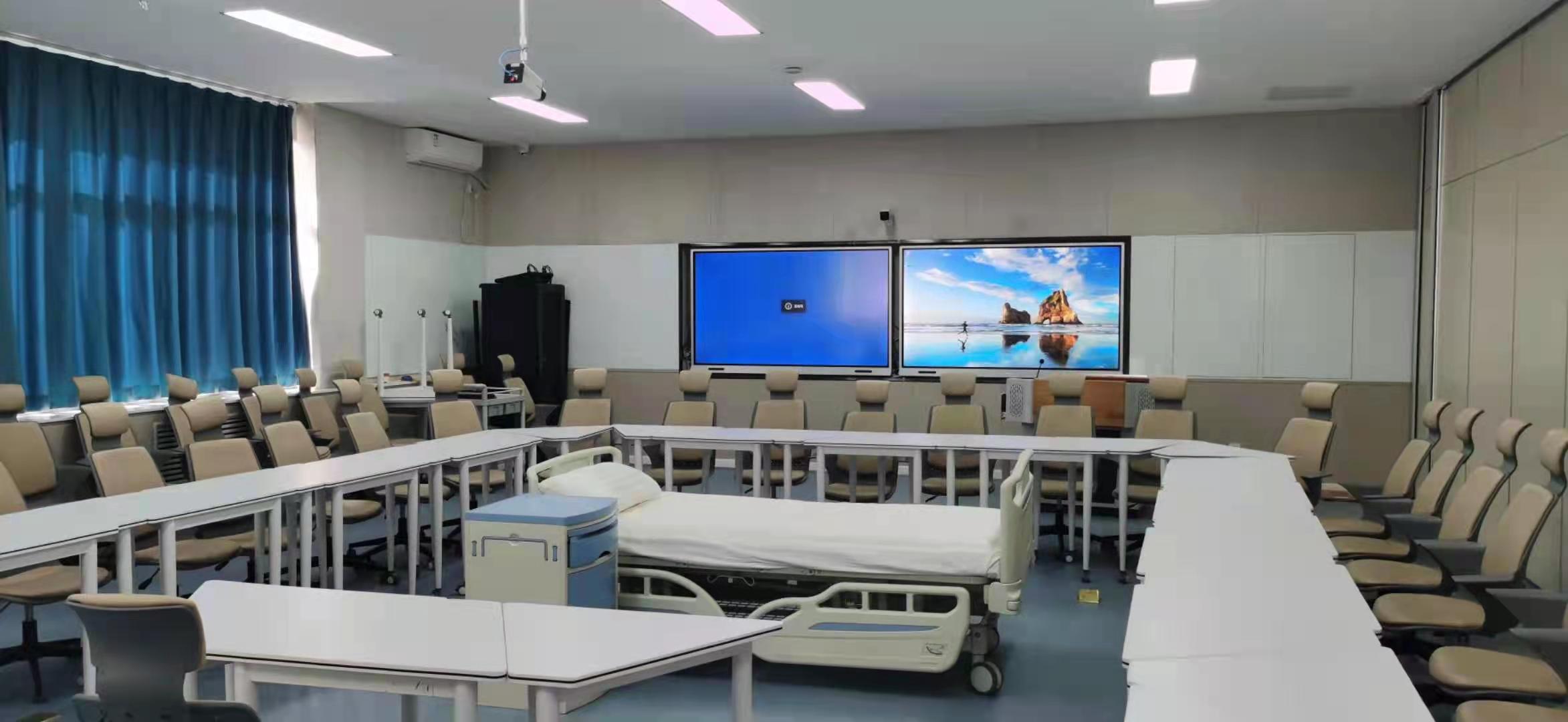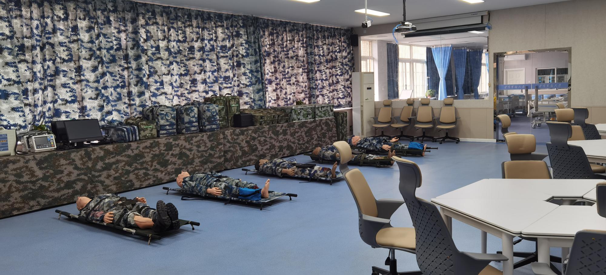 为满足基础护理实训教学需要,根据临床护理发展,不断更新实训教学资源。2011年6月新建成的军事护理综合实训中心设备先进,环境优雅温馨,完全模拟病房设置,充分体现了现代化整体护理的理念,能很好地满足情境模拟、角色扮演等教学活动以及课堂教学实践的需求。实训室设有准备间、中心监控室、模拟护士站等,拥有20张模拟病床,每张病床配有独立实习柜,常规用物实现了1:1~2套。每个实训室配备有中心供氧系统、负压吸引系统、护患对讲系统以及同步摄像教学与监控系统,可将教学实况进行监控,整体观察教学情况,将现代化教学技术全面引入课堂。实训室全程向学生开放,学生可随时进入自主学习。