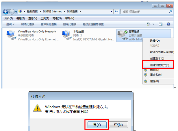11.在刚刚建立的“宽带连接”上点击鼠标右键。左键点击“创建快捷方式”。在弹出的对话框上选“是”,再点击“确定”。