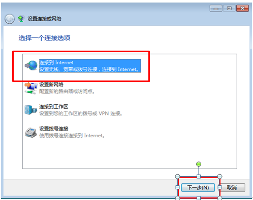 5.选择“连接到Internet”,鼠标左键点击“下一步”。