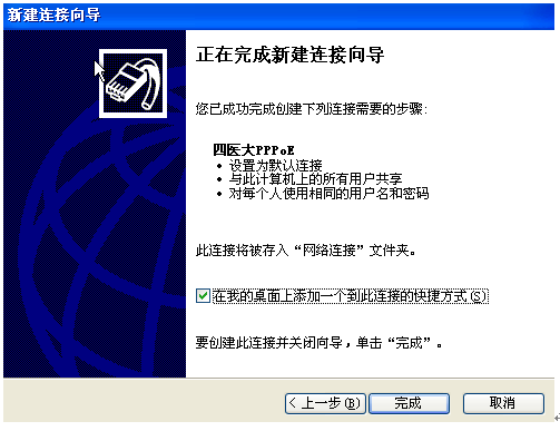 9.点击“完成”,返回桌面双击“四医大pppoe”图标,即可上网。