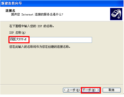 7.输入名称“四医大PPPoE”,鼠标左键点击“下一步”。