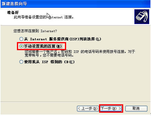5.选择“手动设置我的连接”,鼠标左键点击“下一步”。