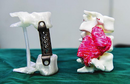 唐都医院骨科教授孙嗣国知道,在一般情况下,医生把肿瘤切除之后,有两种方法做重建,第一种是做钛网,但钛网植入骨头之后,最大的问题是它的下沉率太高。把钛网放到两个椎体之间,由于支撑面积小,上面的椎体很容易沉到下面的椎体之中,脊柱因此会发生变形,孩子以后的行走仍然是大问题。第二种是选择人工椎体,这样接触面积比较大,下沉率要比钛网小很多,临床上应用比较多,但是人工椎体价格昂贵,仅仅椎体本身就得十几万元,还不算手术费用等其他费用,并且人工椎体只有几个固定型号,还不能进行定制,手术效果也不是很理想。