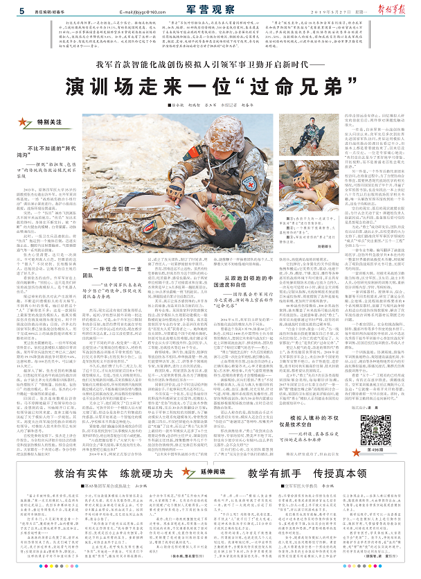 不仅仅是一个张杰,有过参战经历的野战外科教研室主任雷伟,把模拟人看作是“受伤”的战友,为了让技术参数精益求精,先后30余次推翻设计方案;毕业于军事工科院校的刘朝群,为了解决模拟人生理系统建模难关,常常熬到凌晨三四点,不仅把智能化生理驱动算法“死磕”了出来,而且让“勇士”比世界上最好的一款外军模拟人还多了6个生理驱动参数;急诊科主任尹文、颌面创伤外科副主任田磊,搜集整理中外几千个战创伤伤情病例,修正完善后形成现代战创伤伤情病例库……