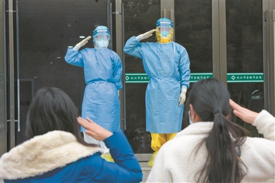 图为两名康复者走出武汉市金银潭医院后,向医护人员敬礼致意。本报记者 范显海摄