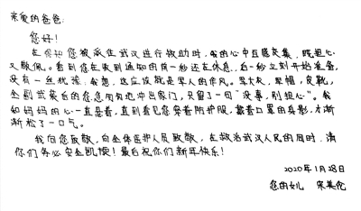 他们的女儿宋美伦,在父母执行任务时,住在姥姥家。由于爸爸平时比较繁忙,她与爸爸的交流并不太多。这段时间,她默默地每天都从网络上查看武昌医院的救治动态,盼望着能找到爸爸的身影。她还跟妈妈要了一张爸爸穿防护服的照片,自豪地分享给同学们,把爸爸称作英雄。大年初四,妈妈在电话里告诉她,爸爸很忙,但一切都好。她想打电话不便,就提笔给爸爸手写了一封信,拍了照,用微信发过去。信虽不长,却在字里行间诉说着对爸爸的想念和敬佩,流淌着女儿的自豪和支持!
