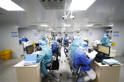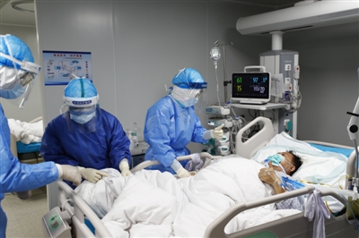 武汉火神山医院重症医学一科医护人员正在救治新冠肺炎患者。人民图片
