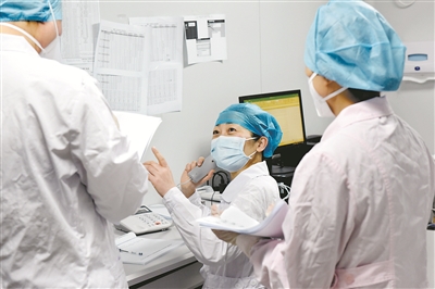 早交班会上,毛青(左)与同事一起研究分析患者治疗情况。