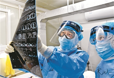 毛青(左)和同事仔细查看患者CT胸片,了解掌握病情。