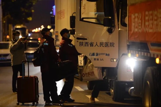 清晨6点多,驰援湖北的陕西国家紧急医学救援队准备撤离。
