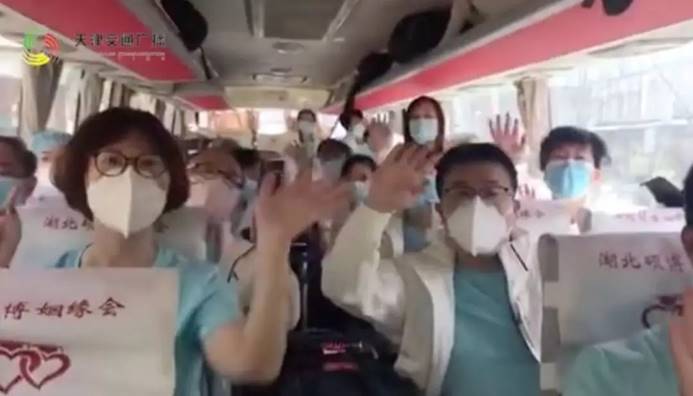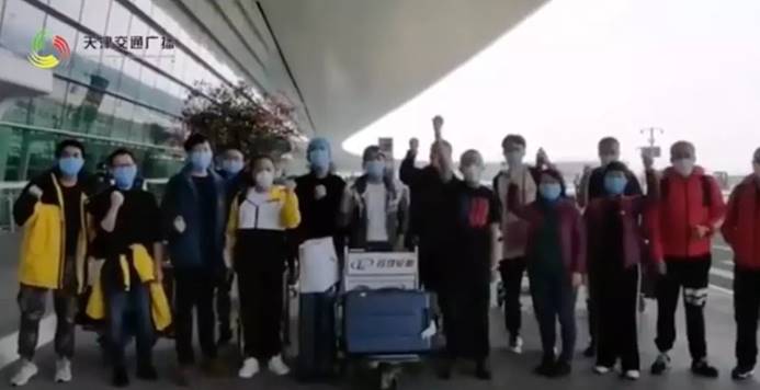 从早上8点半开始,天津驰援武汉医疗队员从武汉出发,启程回津。