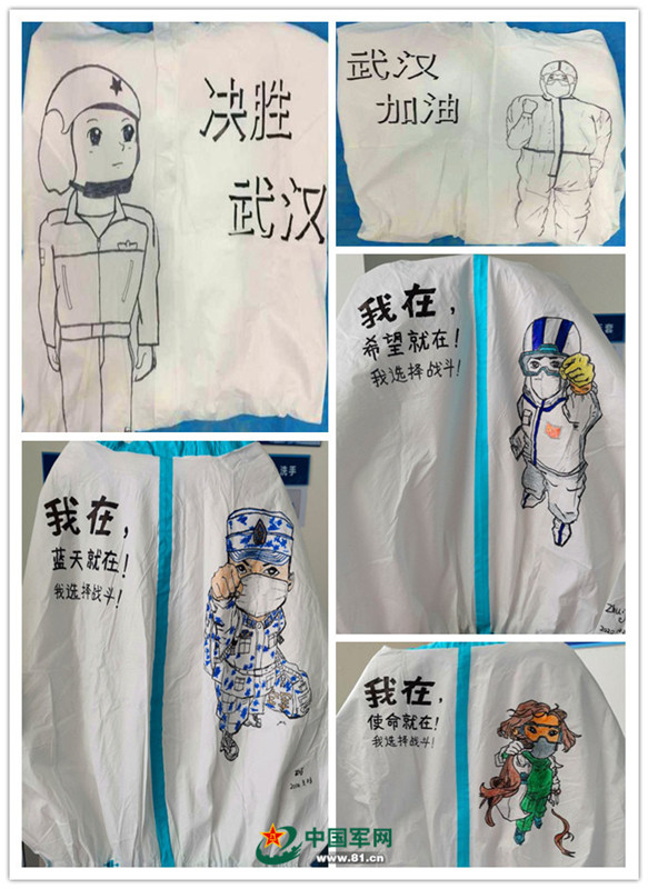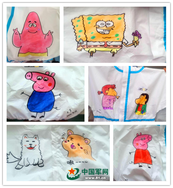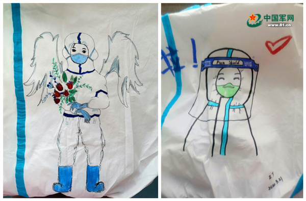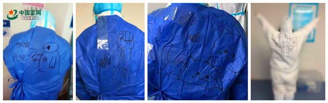 刚一开始,当祝捷值班协助战友穿戴防护装备、在身上书写姓名时,顺手用一支马克笔随意勾勒几笔,短短两三分钟,一幅简笔画便跃然背上。直到有一天,一位从“红区”下班的护士妹妹亲热地挽着她的胳膊,说,“祝老师,今天大家都说我背后的画好漂亮!连病人们看到都说心情好多啦!”看着对方被兴奋点亮的双眸,祝捷意识到自己应该还能做得更多更好。于是,祝捷下班之后继续守在病区,利用休息时间,为一拨拨进入“红区”的战友们在防护服上认真地绘制一幅幅中意的“护心符”。