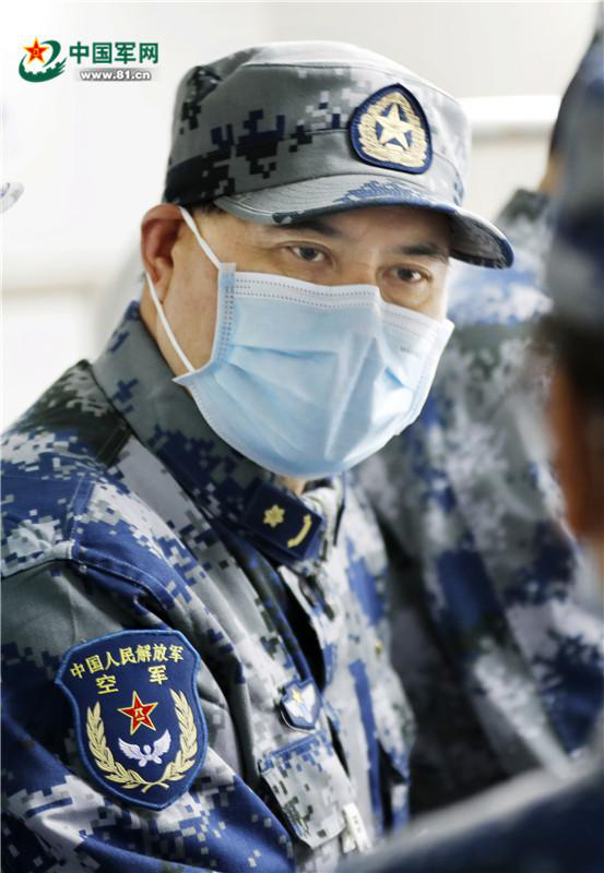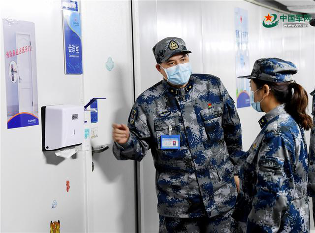 王晓坤(左三)给战友们讲解键盘、桌面等物体表面消毒细节。