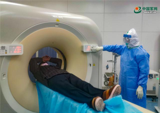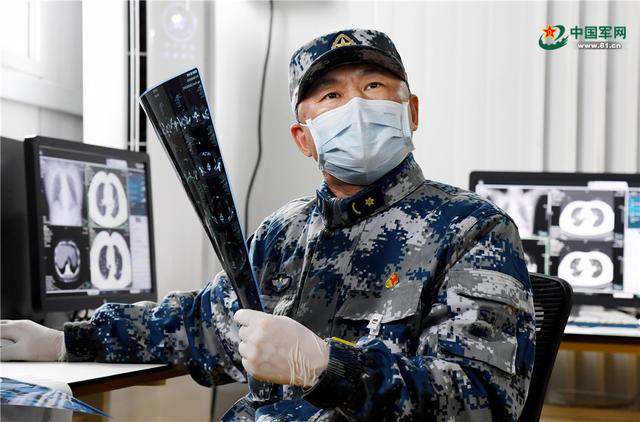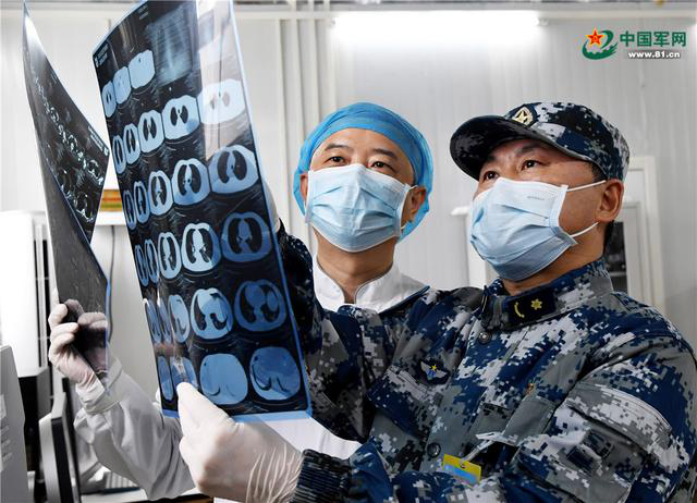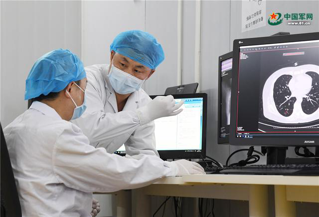 王艳清(右)与战友对患者胸部CT片进行分析。